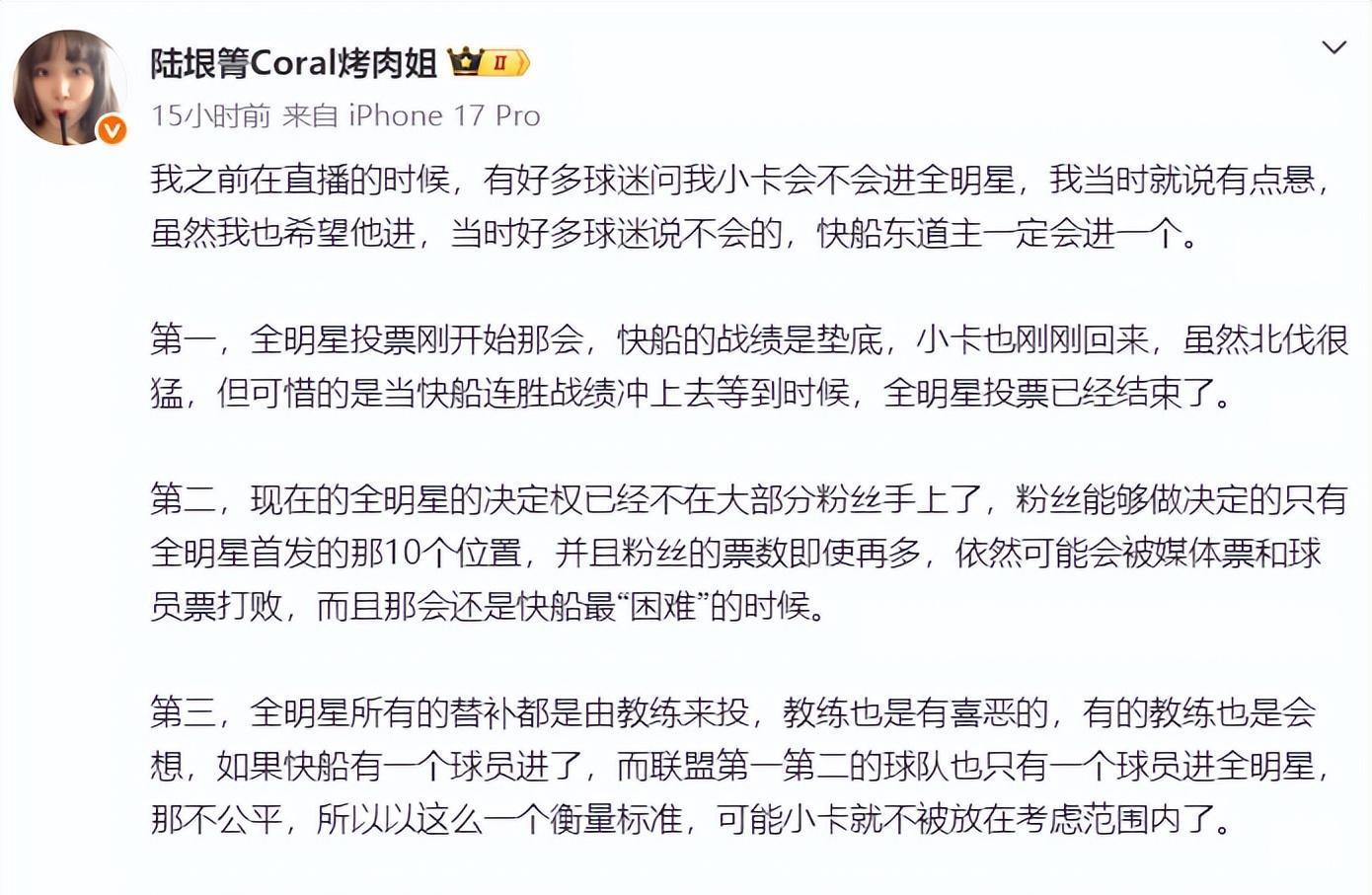 伦纳德的中方经纪人烤肉姐在社媒上详解了小卡落选全明星一事,她一早就说过小卡入选全明星有点悬。