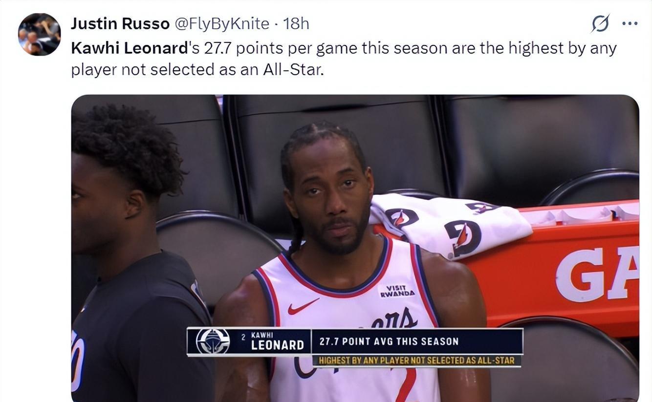 伦纳德是NBA历史上场均得分最高却落选全明星的球员,他本赛季场均27.7分,快船记者Fabdod曾用‘历史上最恶劣的冷落’来形容。