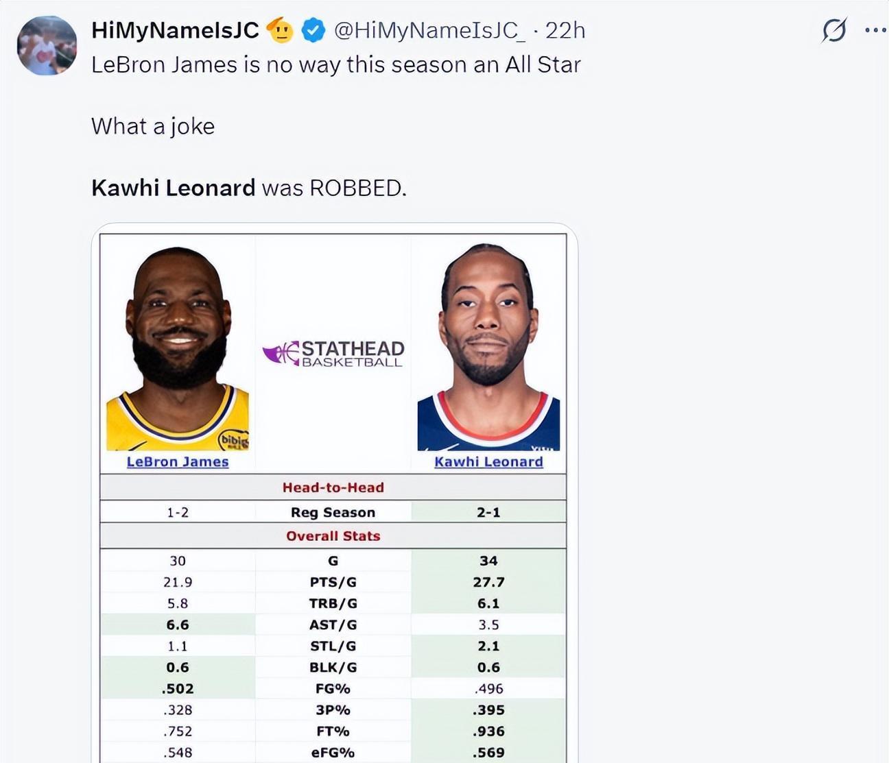 快船媒体晒出詹姆斯、伦纳德的数据对比,伦纳德还比詹姆斯多打4场比赛!