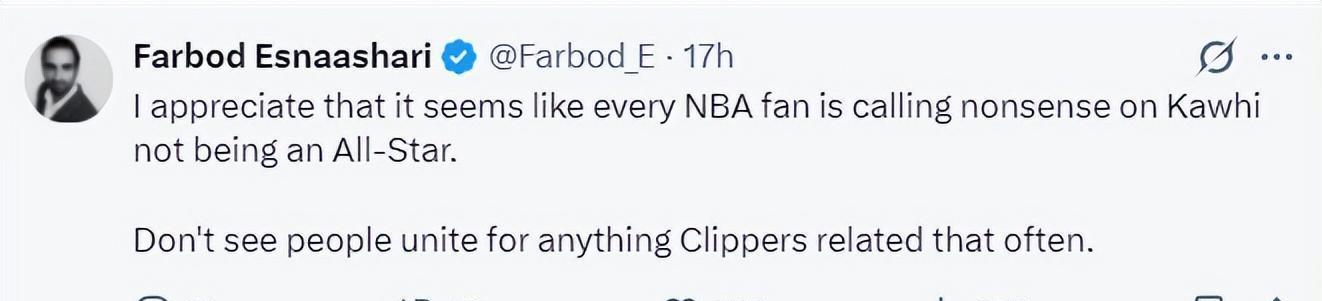 这场比赛后快船记者Fabdod再度提到伦纳德落选全明星阵容一事:我很理解,似乎每一位NBA球迷都觉得小卡不入选全明星极度荒谬,很少看到人们因为快船的相关事情团结起来。